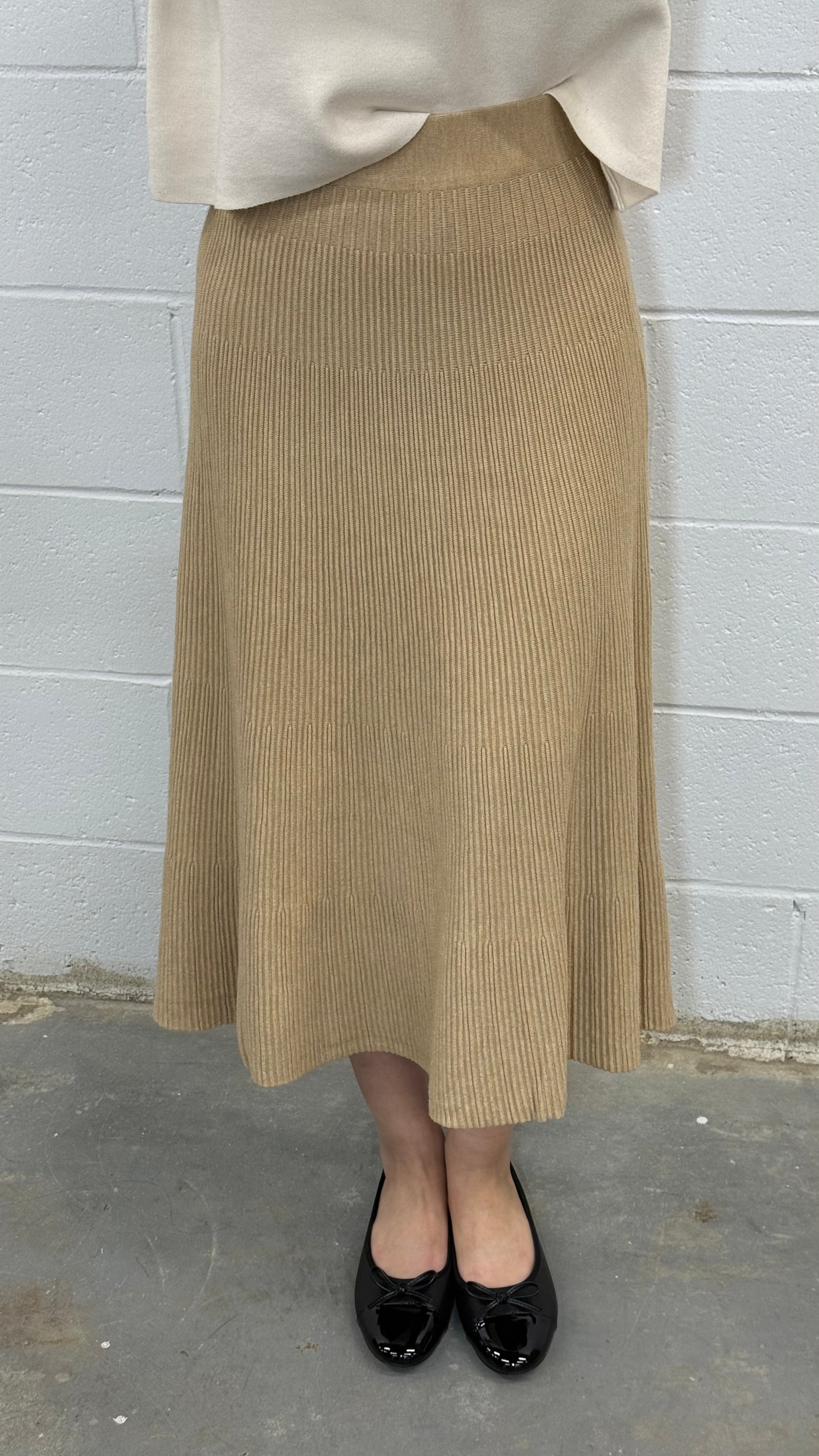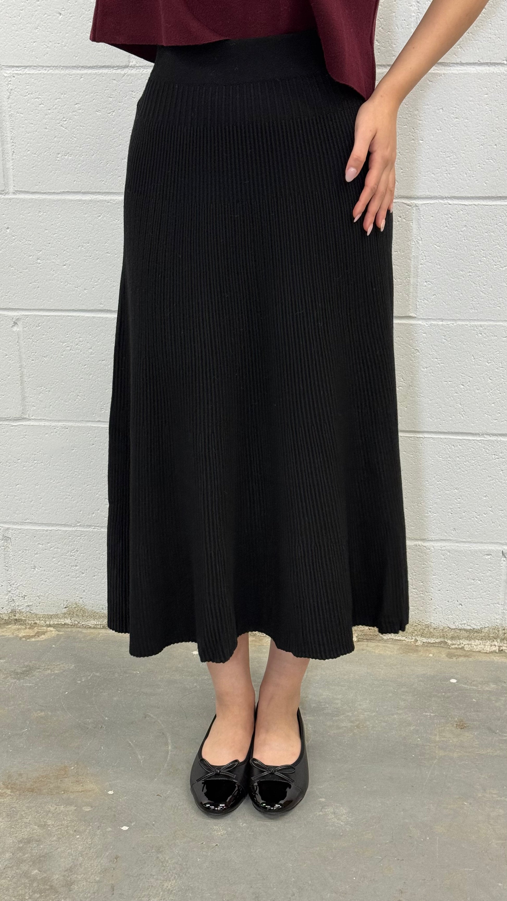 This knit midi skirt is the definition of effortless elegance and everyday comfort. Designed with a flattering high-rise elastic waistband and soft vertical ribbing, it drapes beautifully while offering an easy, flexible fit. The pleated knit texture creates graceful movement with every step, making it ideal for both casual and dressed-up looks. Crafted in a one-size silhouette that comfortably adapts to different body types, this skirt pairs seamlessly with sweaters, knits, or blouses for a timeless, versatile outfit you’ll reach for season after season.