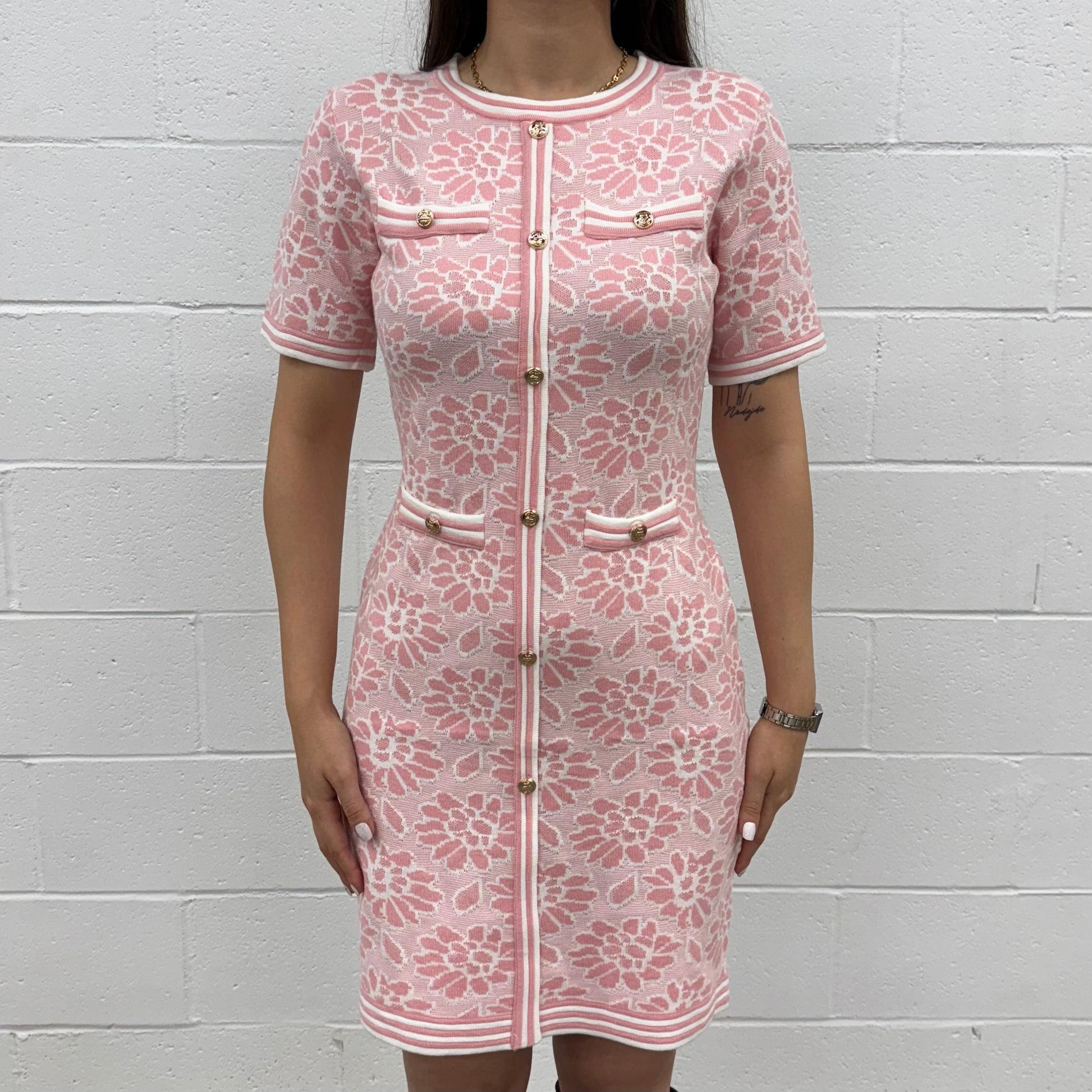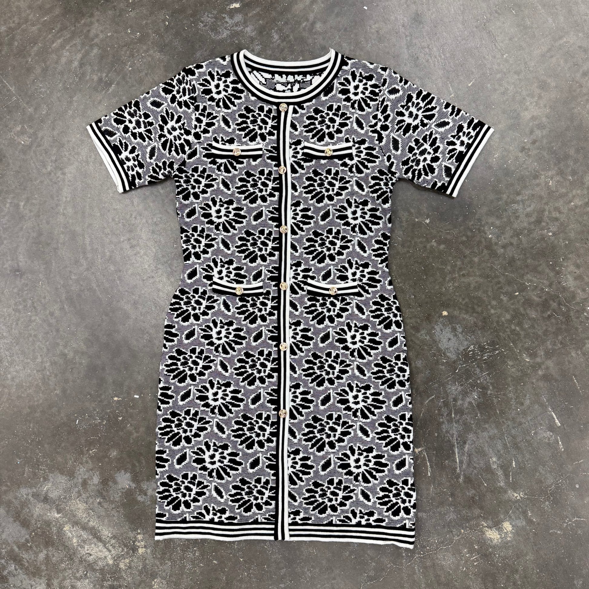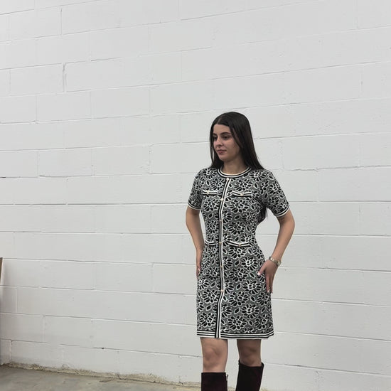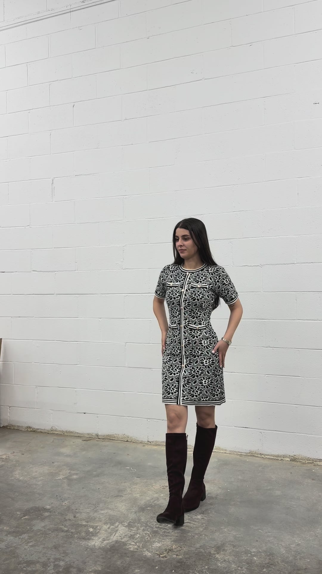 Expertly crafted for chic and elegant women, the Knit Dress Short Sleeve V5855 combines button details with delicate flower knitting for a sophisticated and versatile look. Perfect for daily wear, this dress is a must-have addition to your wardrobe.